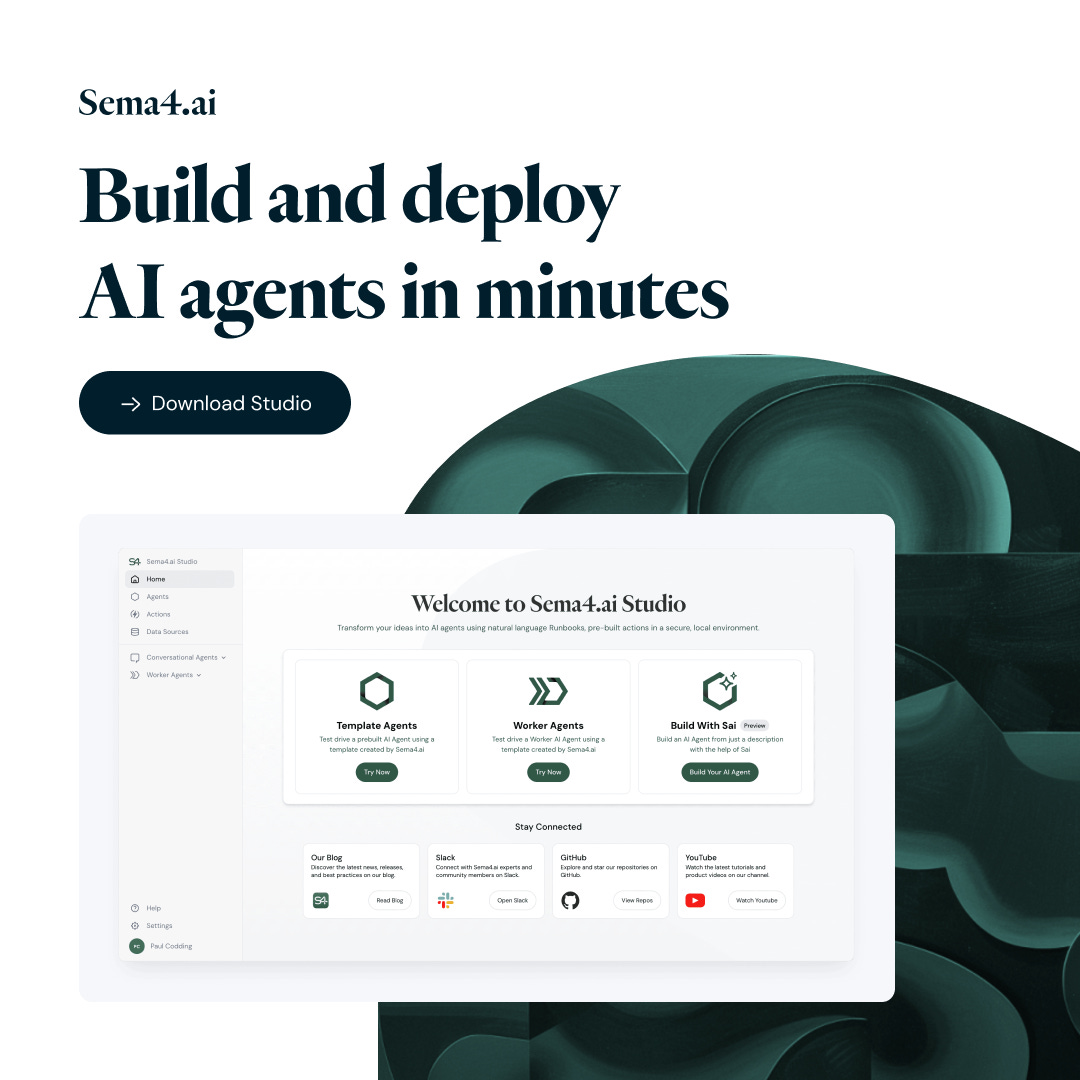 Sema4.ai Studio: Turn ideas into ready-to-deploy enterprise agents in minutes – no system overhauls or rewrites.