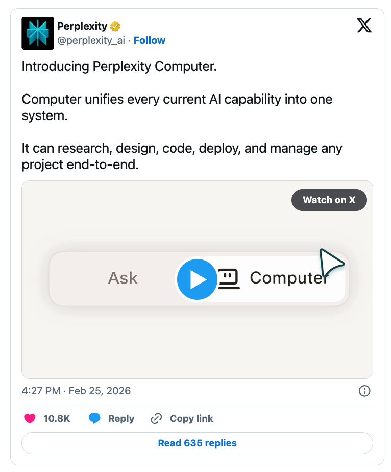 🖥️ Perplexity launched Computer, a general-purpose AI system that researches, codes, and deploys entire projects using 19 specialized models. (continue reading)