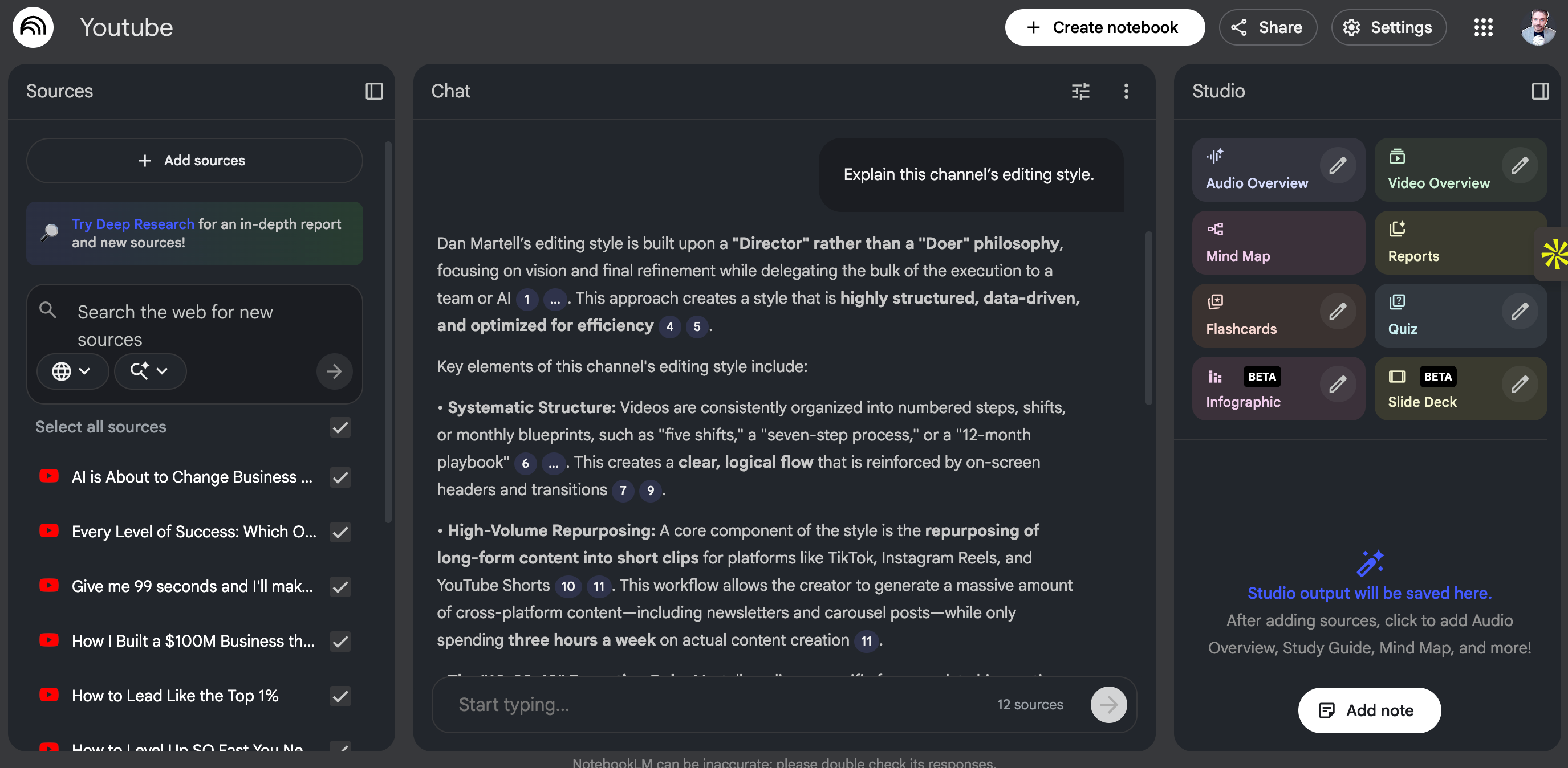 NotebookLM will now start crawling every video. It extracts: