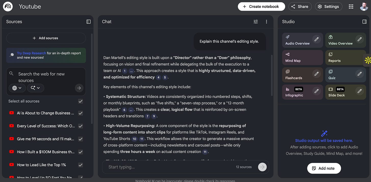 Today you’ll build a simple “chat-with-the-channel” setup using NotebookLM, so you can study any creator like a coach and pull the patterns into your own content.