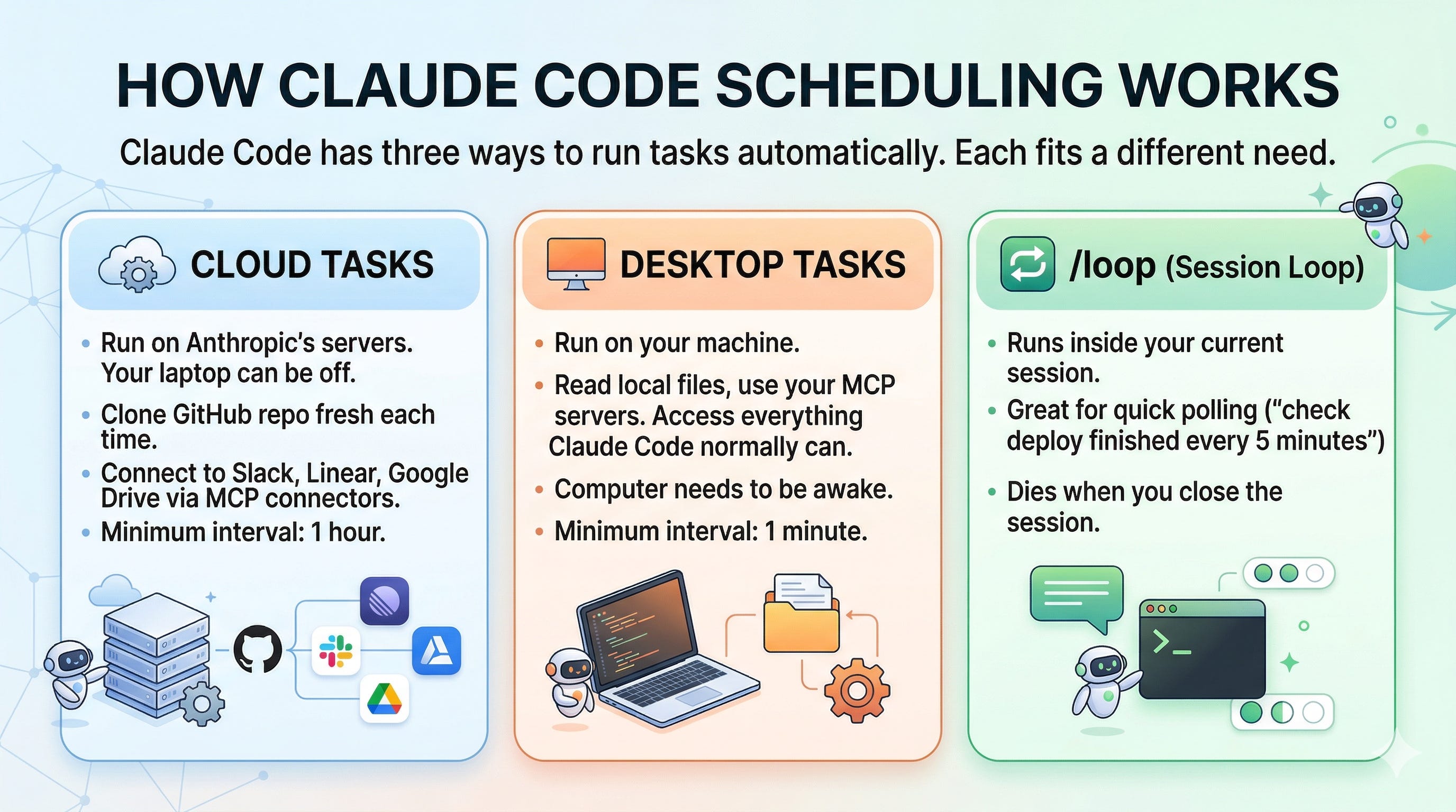 ☁️ Cloud Tasks run on Anthropic’s servers. Your laptop can be off. They clone your GitHub repo fresh each time and can connect to Slack, Linear, Google Drive via MCP connectors. Minimum interval: 1 hour.