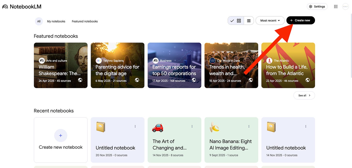 Inside NotebookLM click “New Notebook”.