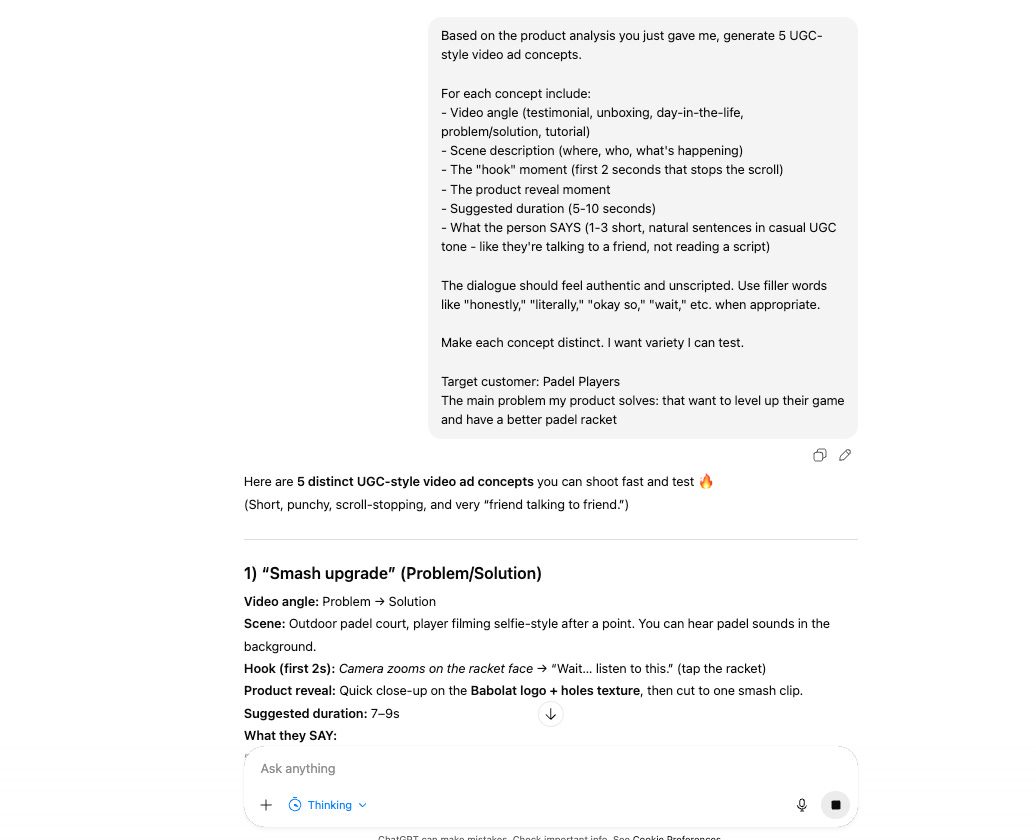 Be specific and detailed. I'll use this to generate UGC-style video content with dialogue.ChatGPT will now give you a rich breakdown of your product.